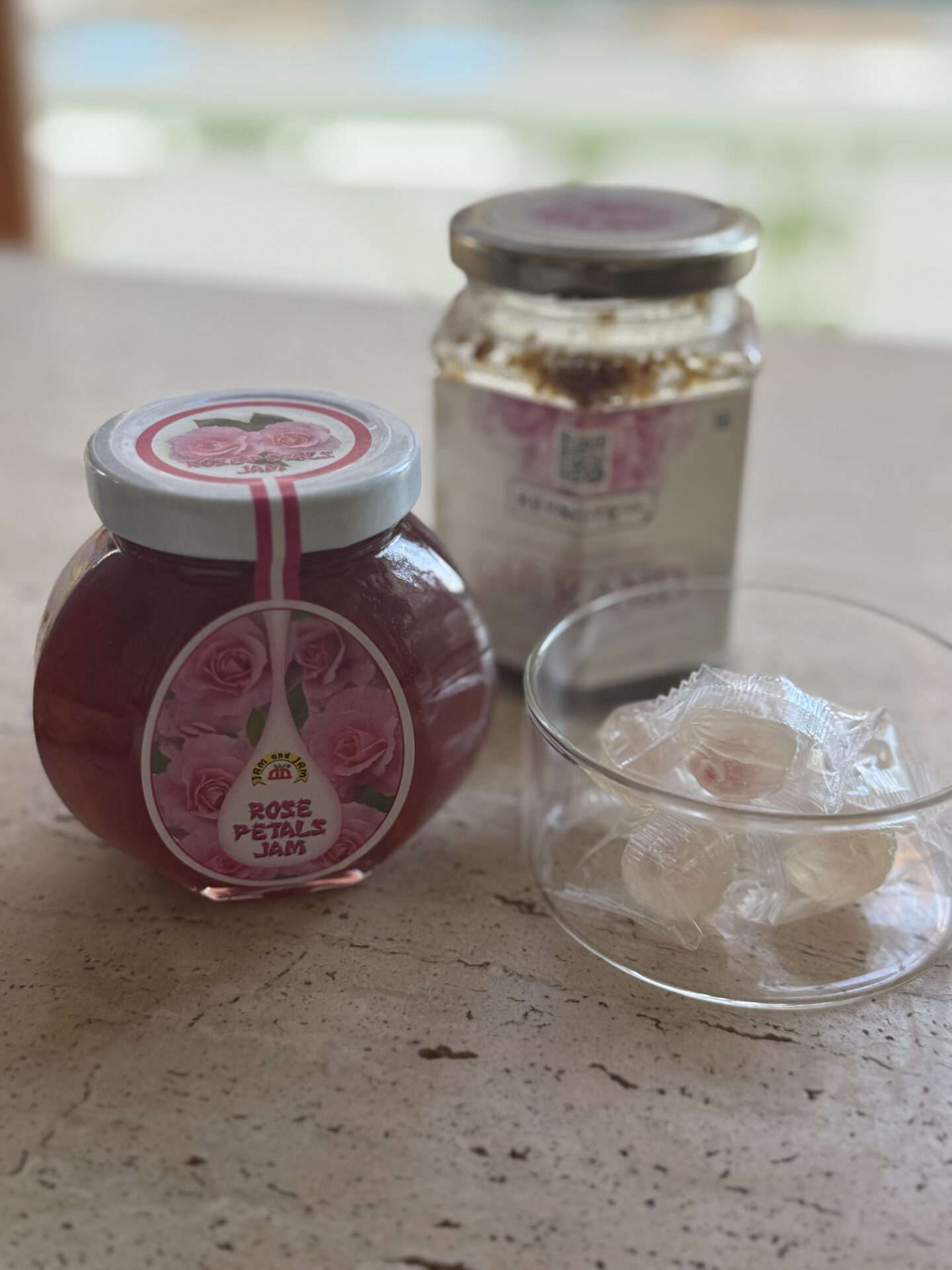 ローズを使った美味しいジャムやキャンディはアーユルヴェーダを知っている人ならみんな大好き。手前のキャンディとジャムは軽井沢のお土産としていただきました。