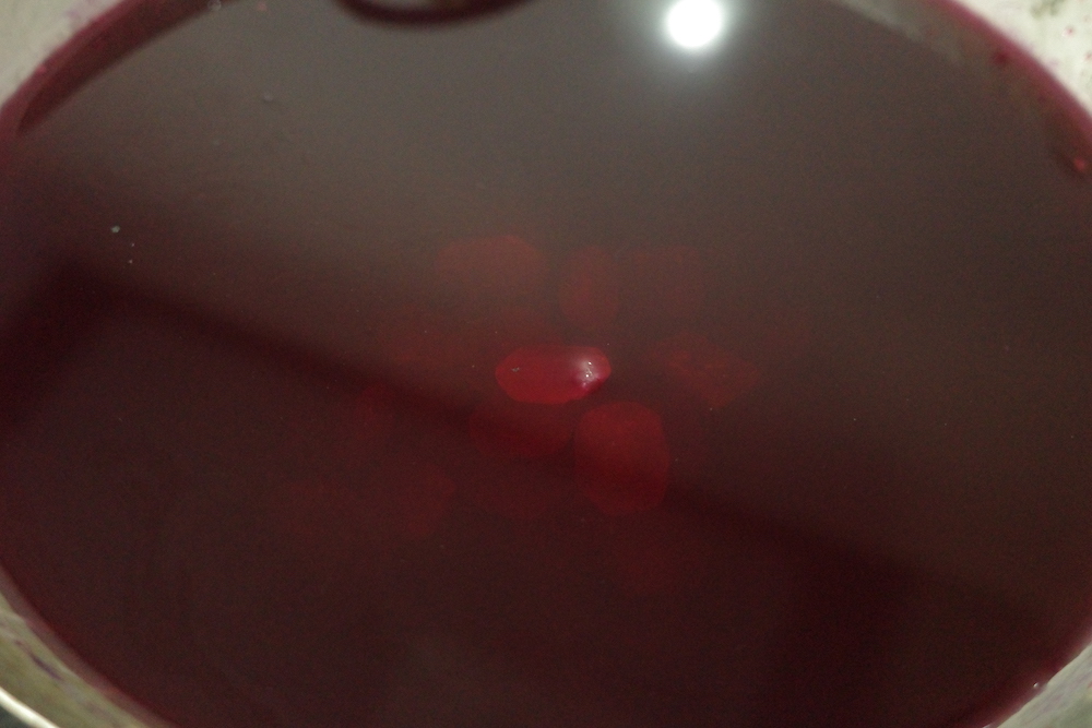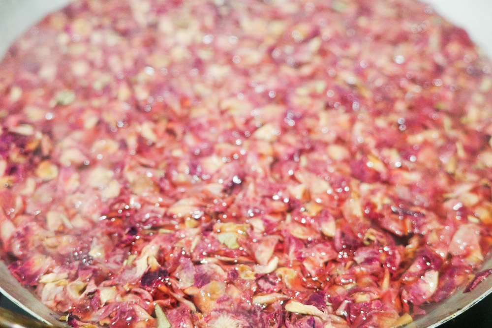 - 氷砂糖を入れて、半分まで煮詰める特にローズペタルは煮込むとえぐみが出るので、熱湯に入れたらすぐ火を止めること